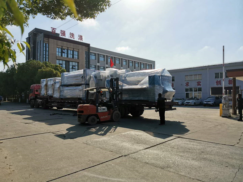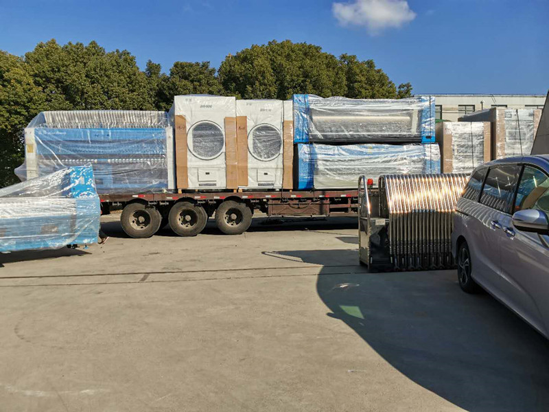 此次發貨北京的產品有:3臺100公斤洗脫機、2臺100公斤烘干機、1臺送布機、1臺燙平機、1臺折疊機。